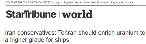 افزون بر این، دو استار تریبون هم از رسانههایی بود که با همان خط پیشین به تحلیل این خبر پرداخت و با تأکید بر ترس غرب از تلاش ایران برای ساخت سلاح هستهای نوشت و تأمین سوخت هستهای برای کشتیها را بهانه جدید ایران دانست.